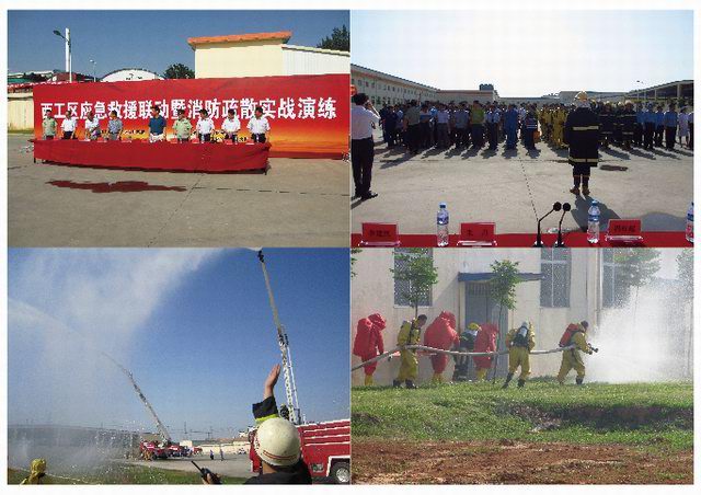 洛陽市安監(jiān)局領(lǐng)導(dǎo)、洛陽市消防支隊領(lǐng)導(dǎo)、區(qū)領(lǐng)導(dǎo)迅速趕赴現(xiàn)場指揮救援,8臺消防車、2臺救護車在公安交警車開道下呼嘯而至,120名消氣防戰(zhàn)斗員訓(xùn)練有素展開救援,生產(chǎn)調(diào)整組、安全環(huán)保組、警戒保衛(wèi)組、設(shè)備搶修組、信息管理組共50人分別按預(yù)案井然有序開展現(xiàn)場工作。由于反應(yīng)迅速,處置得當,沒有造成周圍水體、空氣環(huán)境污染,沒有發(fā)生其他次生事故,1名中毒的現(xiàn)場操作人員得到及時救治。本次演練為力求貼近實戰(zhàn),對突發(fā)事故應(yīng)急處理真正起到指導(dǎo)和演練作用,改變以往演練模式,應(yīng)急指揮部演練中還臨時增設(shè)了演練科目。